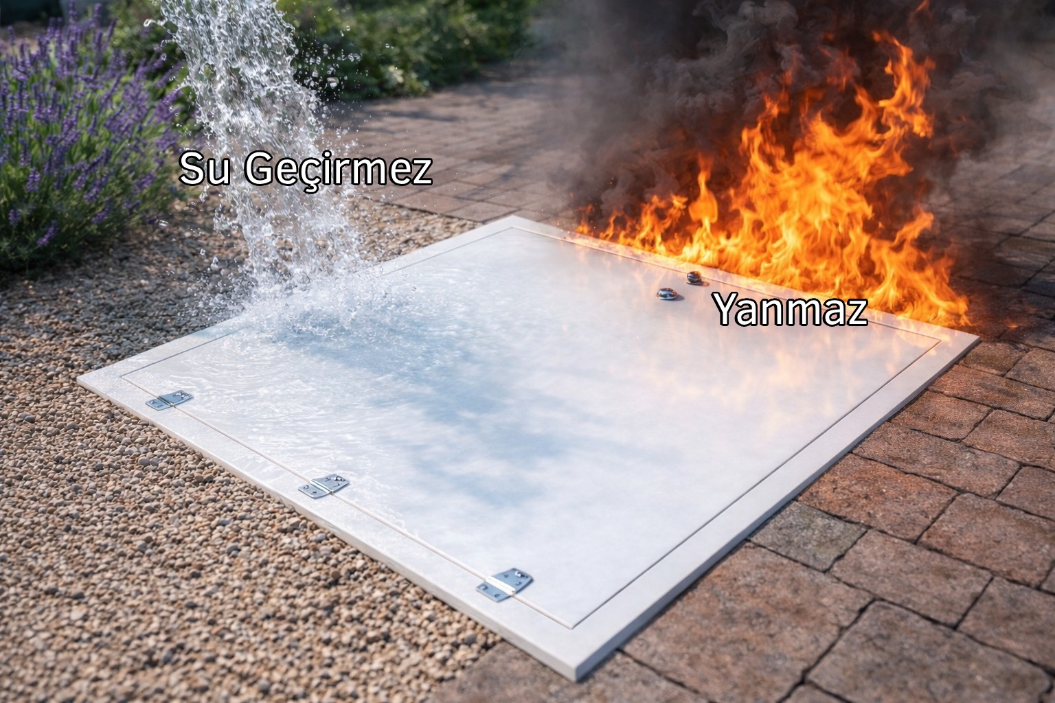 - Yüksek kaliteli kompozit panel teknolojisi ile imal edilen kapaklarımız; su geçirmez yapısı,